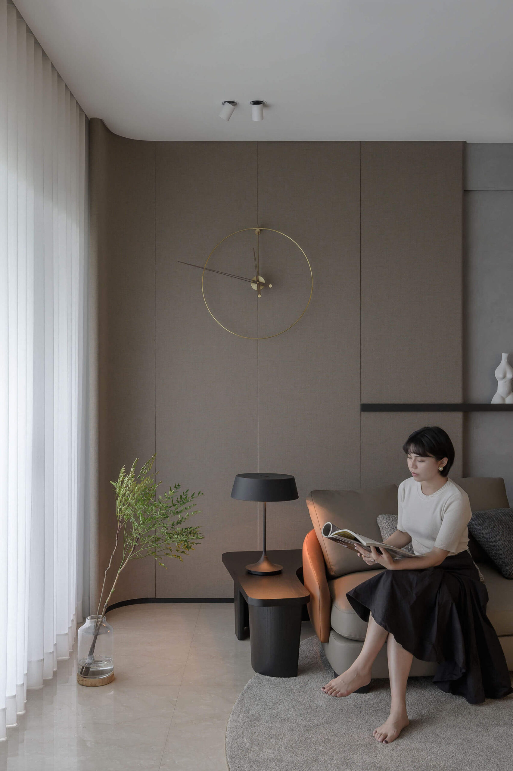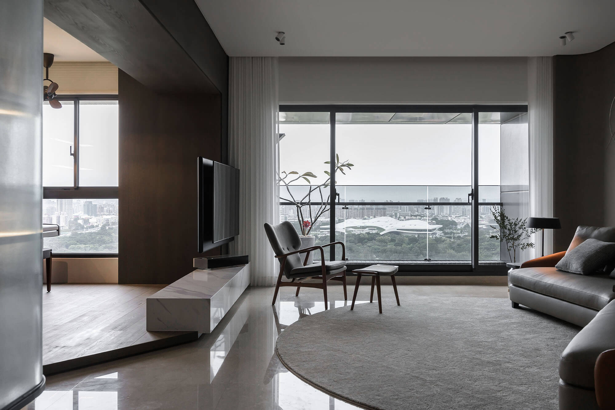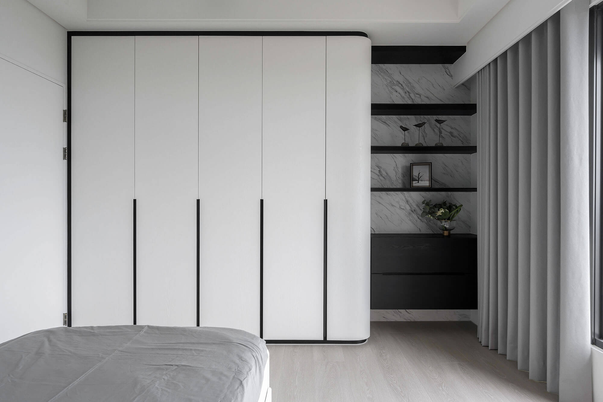 主臥室以繃布做為床頭背牆,增加沉穩安定的氛圍,床頭不對稱的燈具,增加獨特個性,次臥室各具風格,以導弧角修飾櫃體,貼附大理石豐富細節,女兒房以藕色系做為主視覺,透空的展示層架則虛化量體的沉重感。寬闊視野卻多重的使用空間,讓居住在裡面的主人,與窗外的大景結合,擁抱此一大器無華的空間