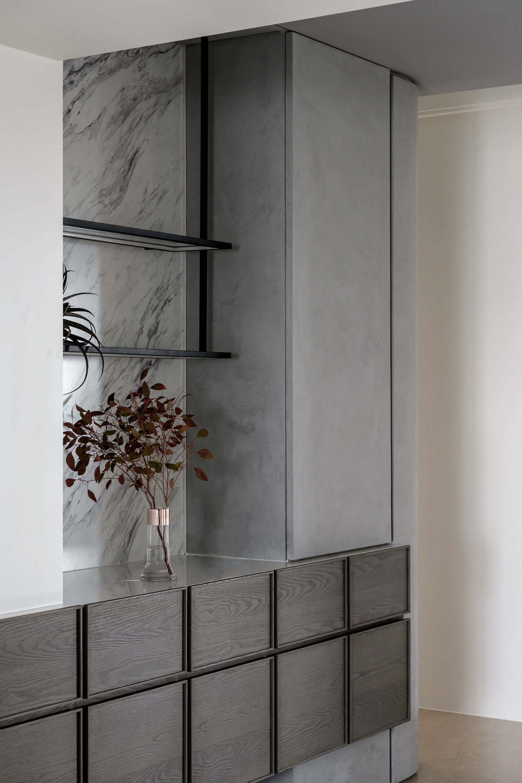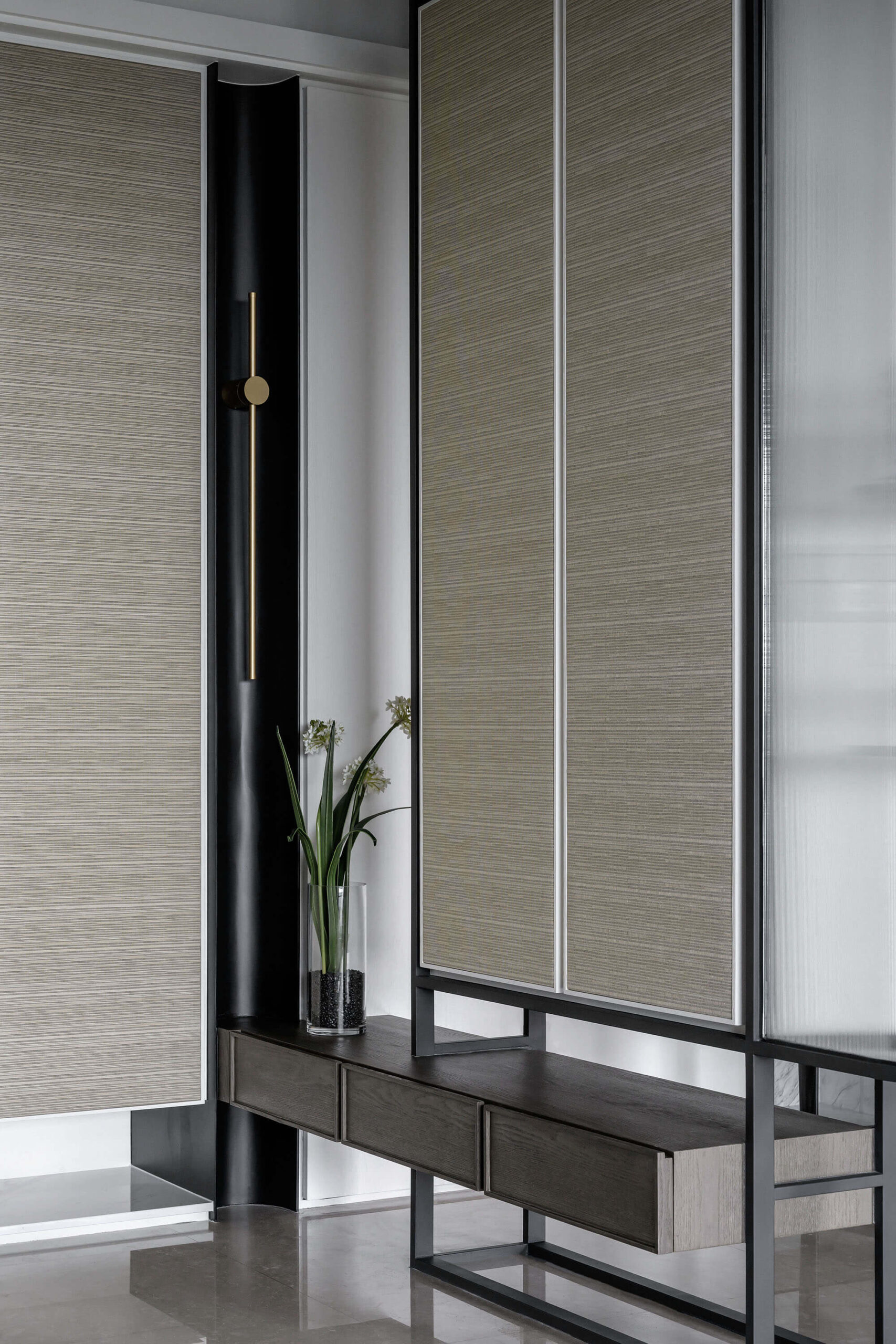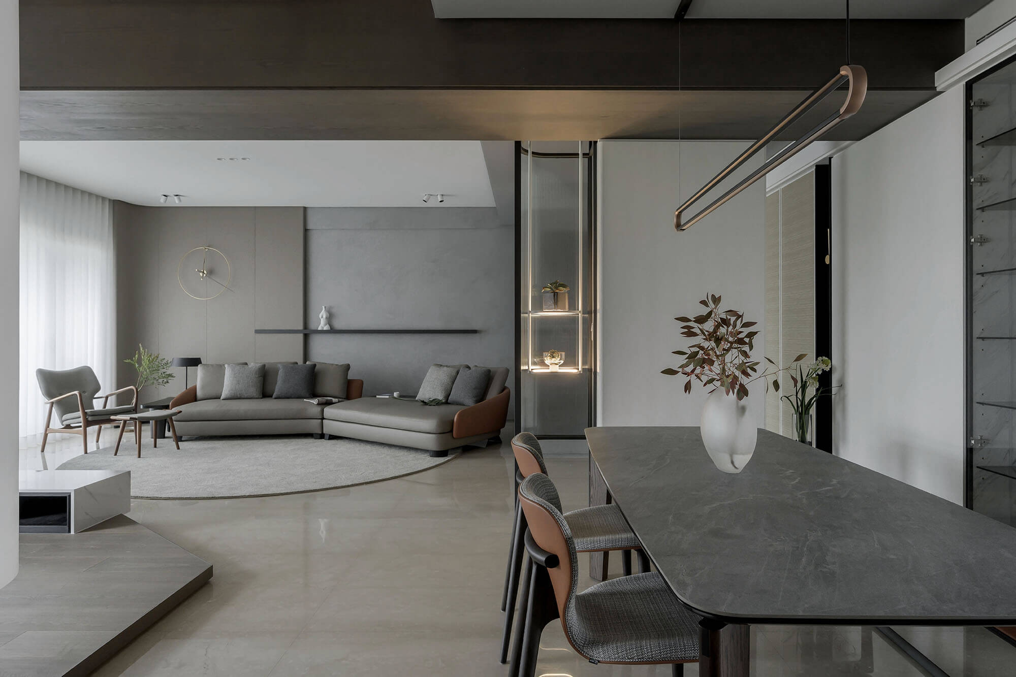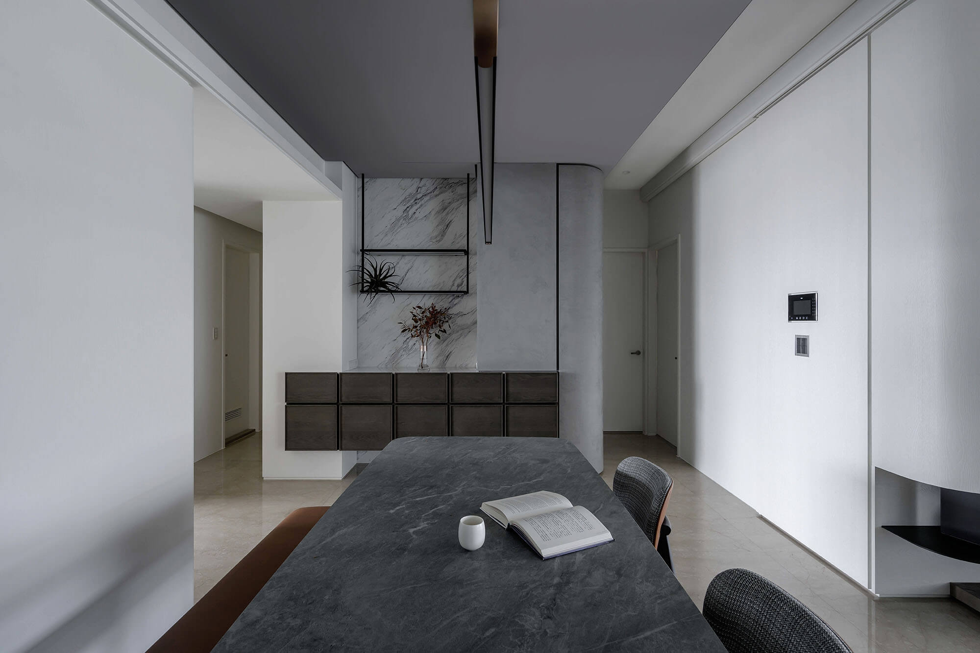 主臥室以繃布做為床頭背牆,增加沉穩安定的氛圍,床頭不對稱的燈具,增加獨特個性,次臥室各具風格,以導弧角修飾櫃體,貼附大理石豐富細節,女兒房以藕色系做為主視覺,透空的展示層架則虛化量體的沉重感。寬闊視野卻多重的使用空間,讓居住在裡面的主人,與窗外的大景結合,擁抱此一大器無華的空間