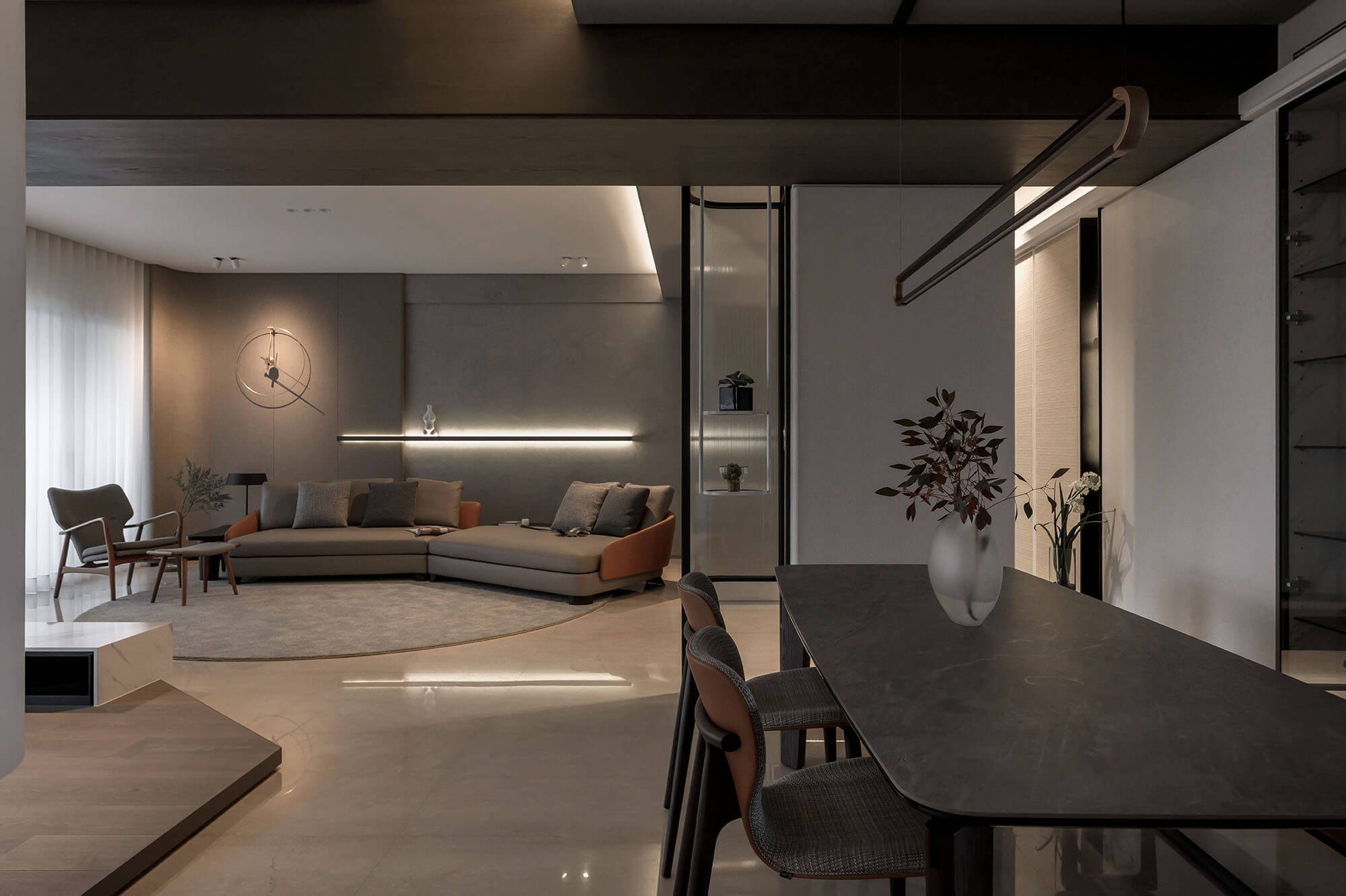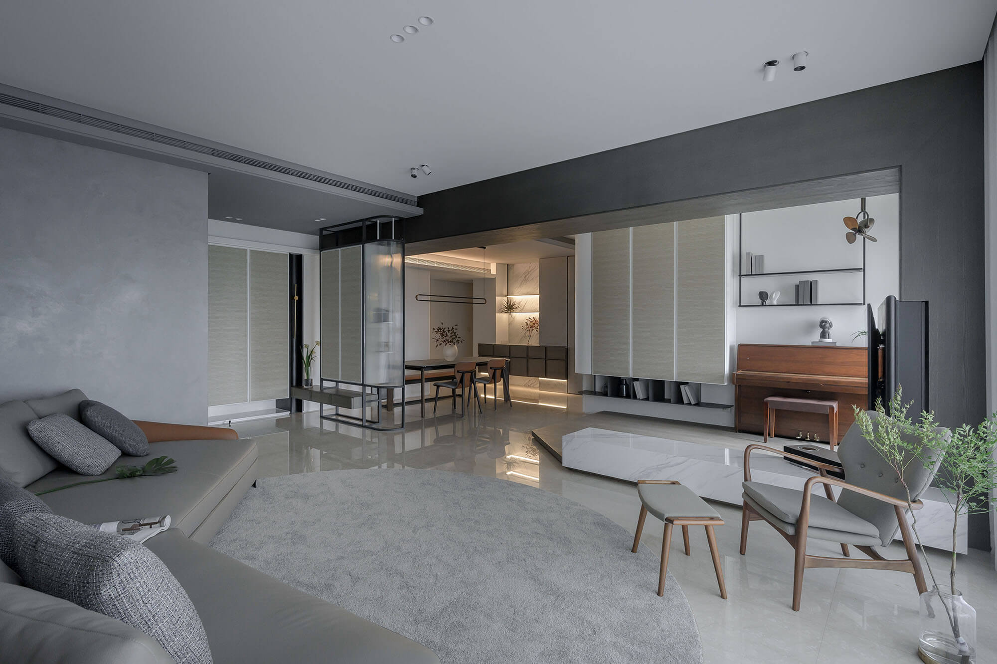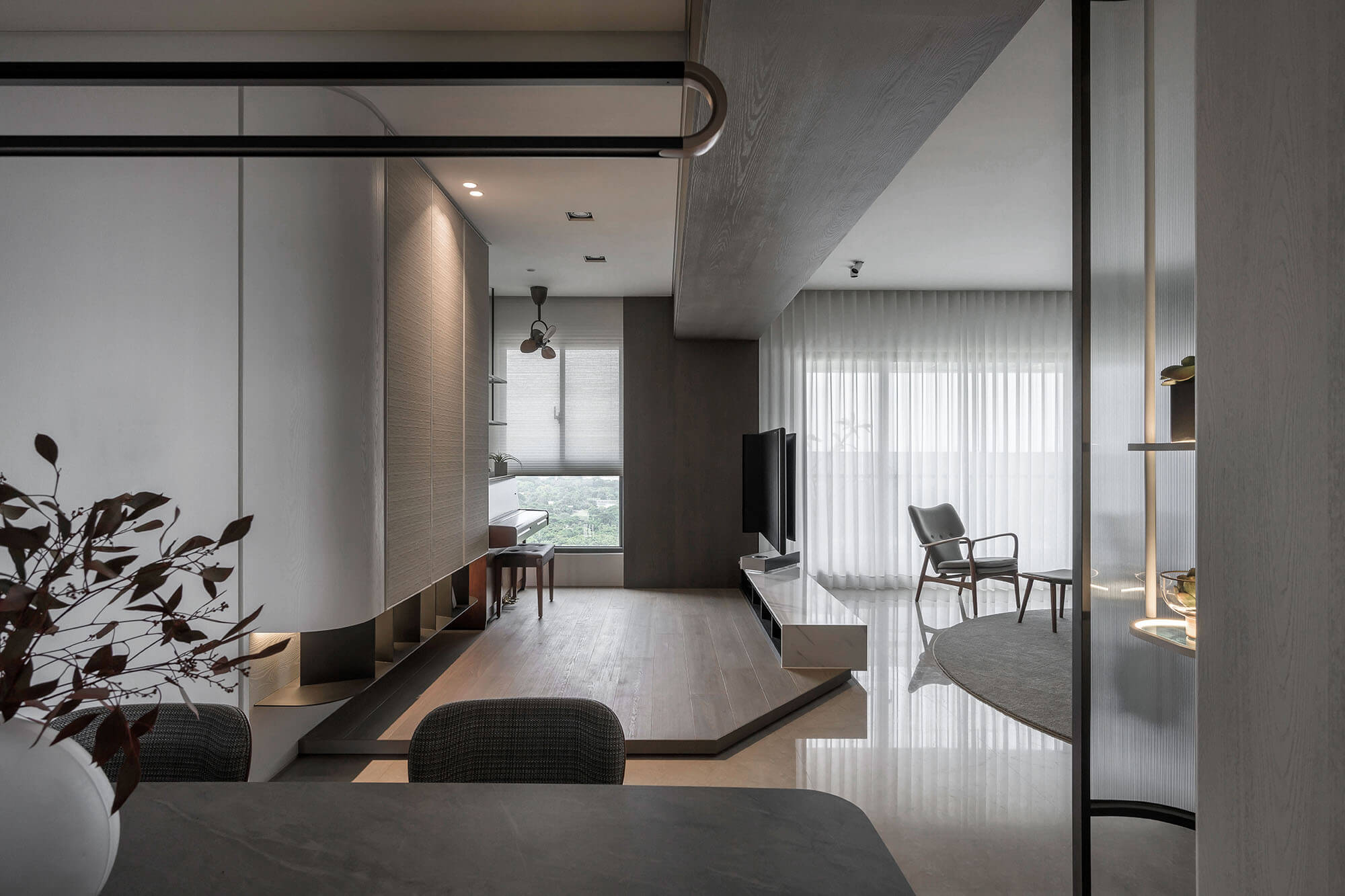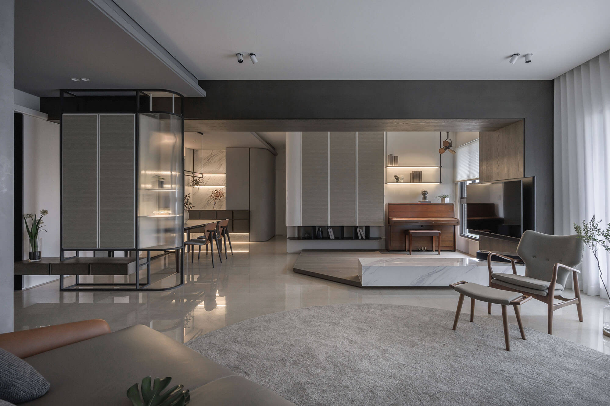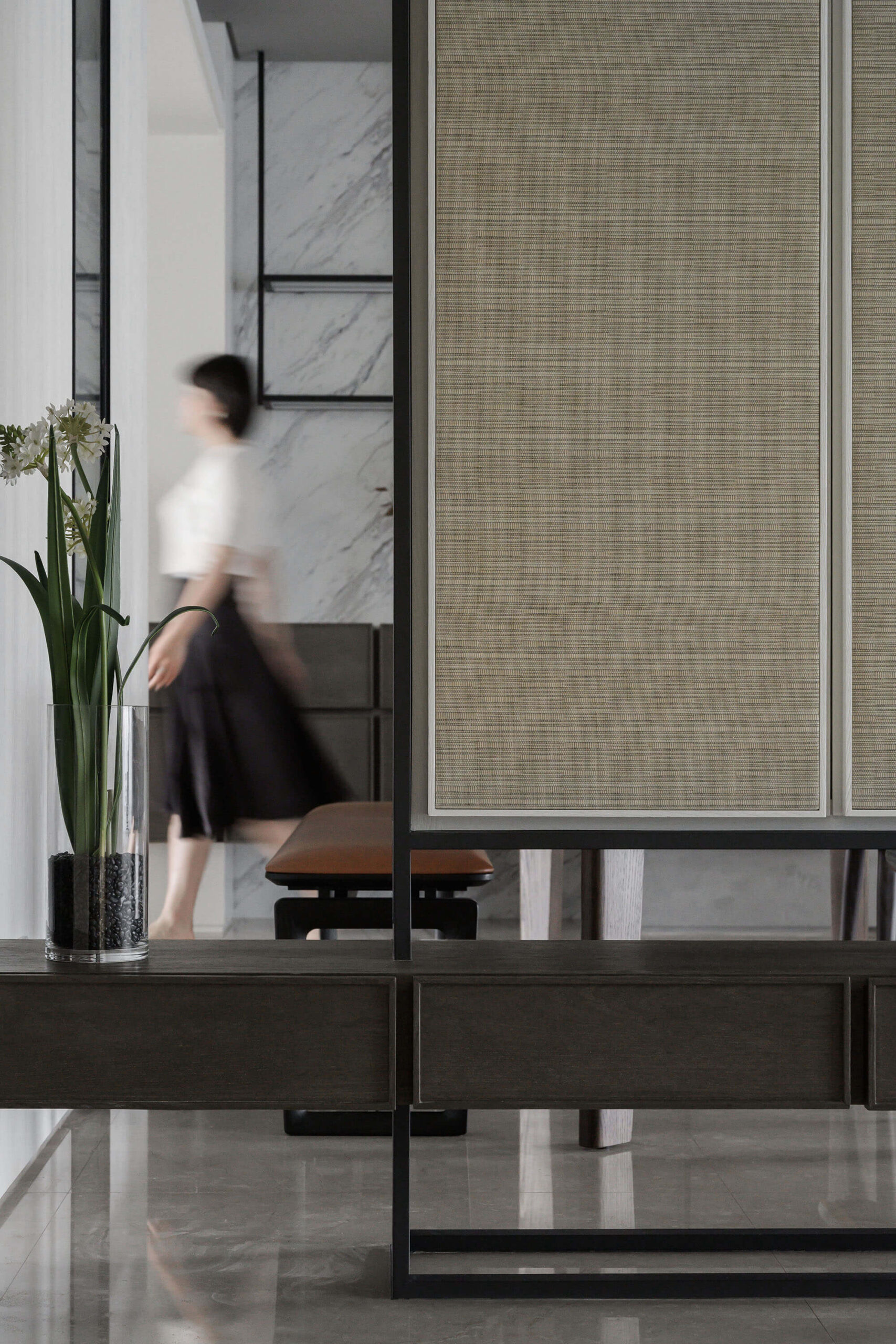 享有全面高雄衛武營的全面綠景,是此案的最大特色、屋主希望能以景為主,裝修為輔創造97坪三房兩廳的混搭風,居住成員為一家四口,不想有電視牆、保持空間開闊,讓坐臥起居都能享受窗外景致。方品空間設計的設計師張紜珮,以細膩的設計和規劃,將空間每個立面創作為一幅獨特的風景,更賦予無與倫比的豐富特色。 利用鐵件輕盈的特性,與櫃體和玻璃質材,創造出藝術感的屏風,保有穿透性的屏風,有收納和展示收藏的功能,更確保公領域的開放性,同時成為精彩設計的一部分。 木皮貼附建築體既有的大樑,成為空間中的中介、作為懸掛電視的位置,電視透過獨特的五金角料,可自由調整角度,弧形沙發讓人起居間飽覽遼闊景致,架高地坪新增多功能區,同時達到區隔空間的目的,餐廳區以餐邊櫃做為端景,同時形成分隔進入私領域的分界。